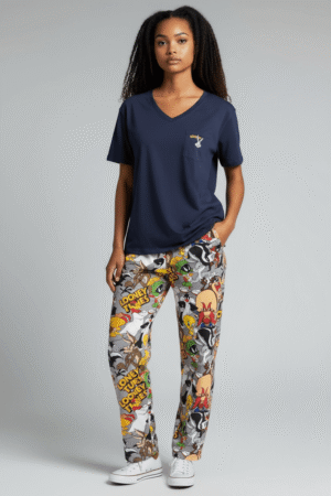 • Estampado Caótico y Femenino (Shorts): Los shorts son una explosión de color y personalidad. El estampado presenta un frenético collage de todos los personajes más famosos (Bugs Bunny, Pato Lucas, Piolín, Silvestre, Taz), con el estilo de dibujo animado vibrante, contornos gruesos y colores saturados que recuerdan la estética retro.