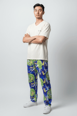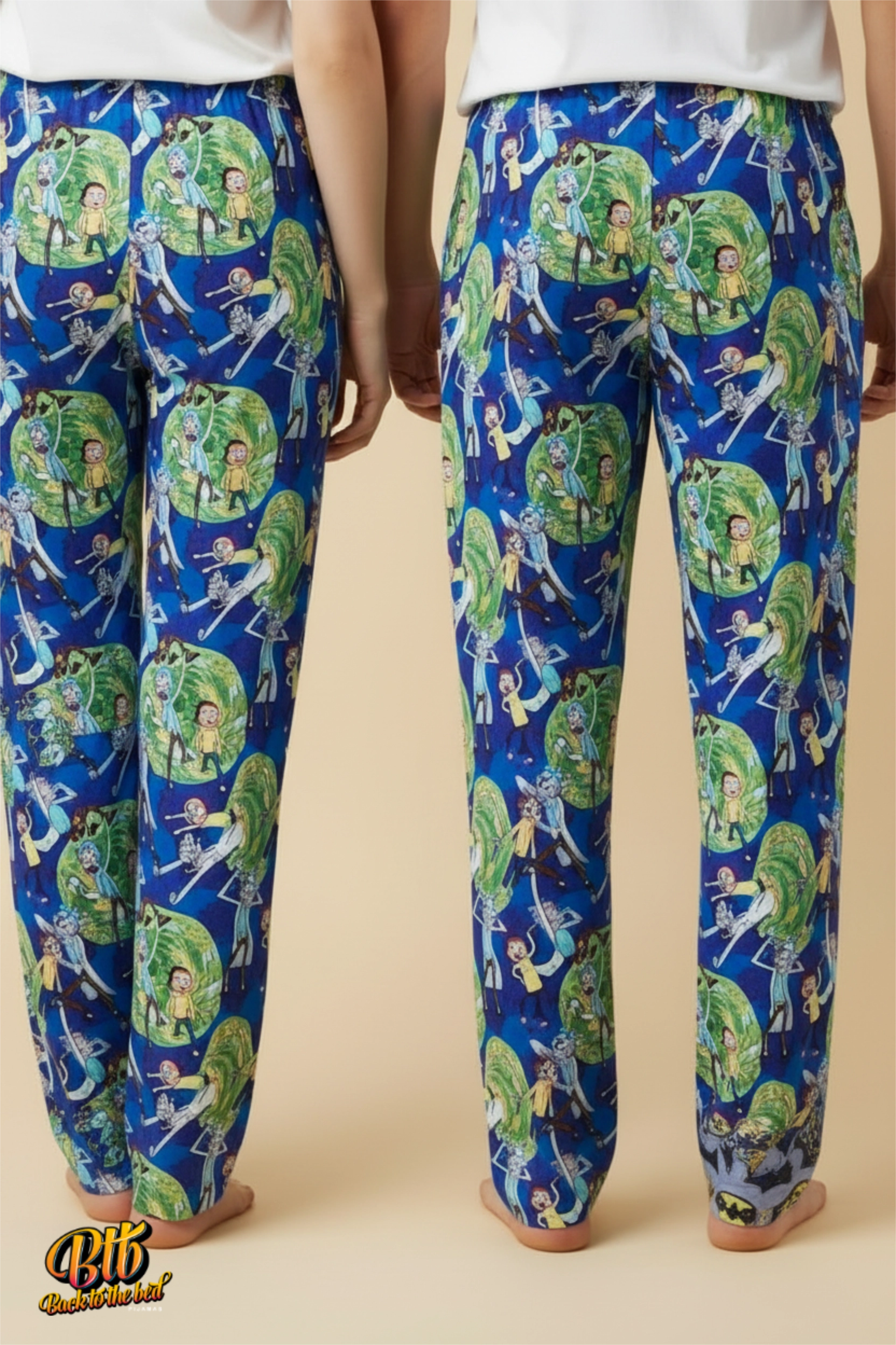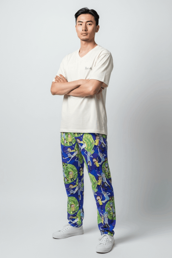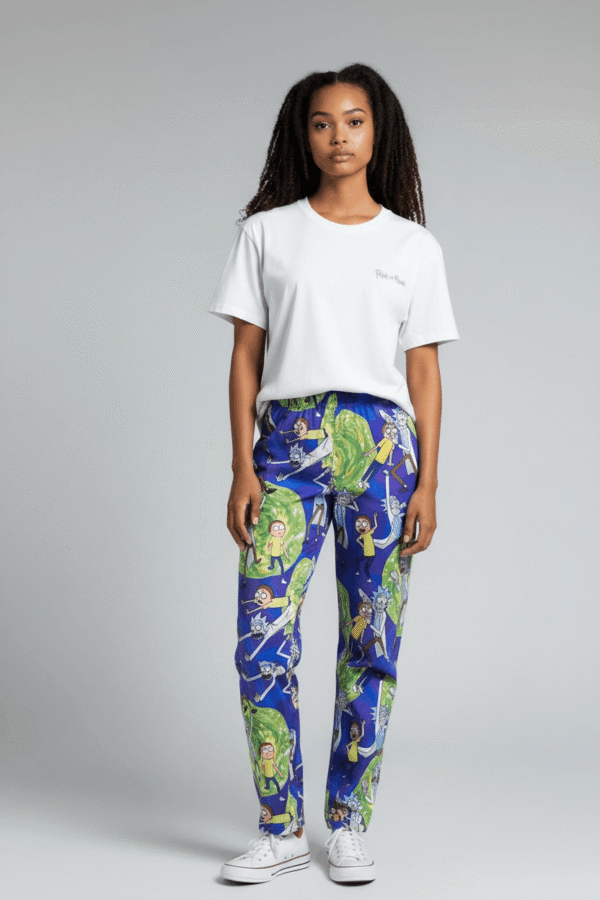 Estampado Multiverso : Los Pantalones son una explosión de color. Presentan un vibrante collage que incluye a Rick, Morty, el icónico Portal Verde, Pepinillo Rick (Pickle Rick) y diversos elementos espaciales, todo con colores neón y contornos definidos que resaltan sobre el fondo.