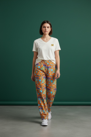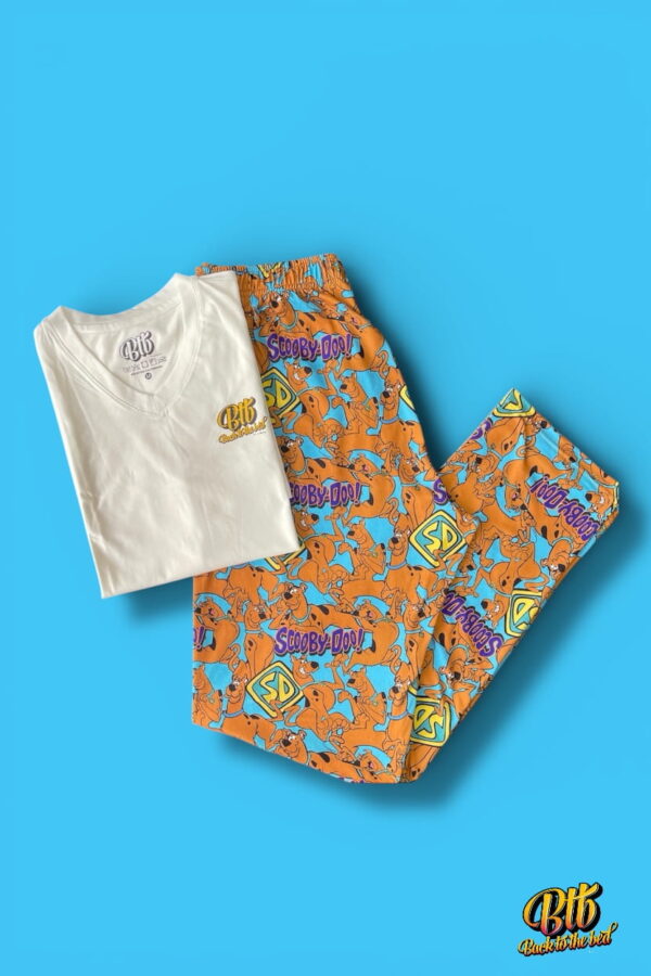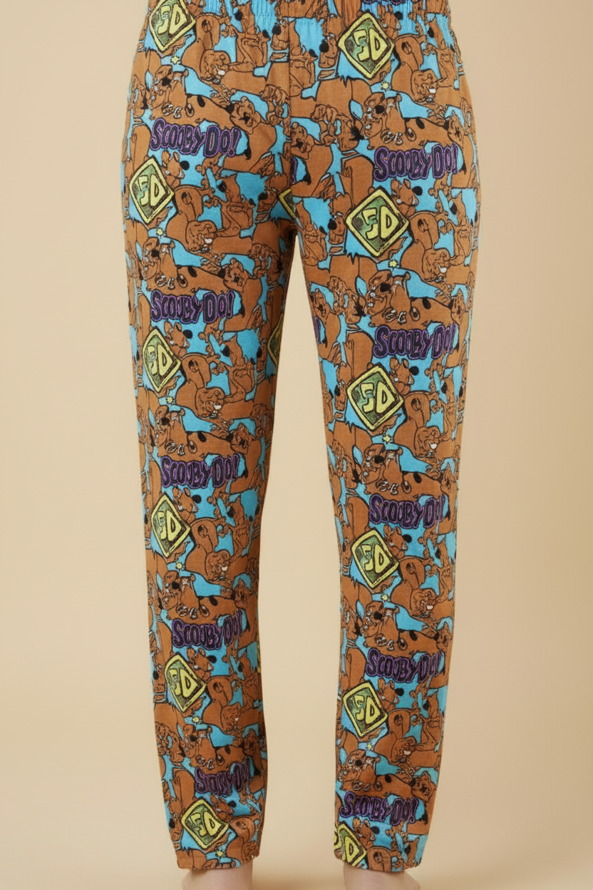 Estampado de Misterio (Pantalón Largo): El pantalón es el protagonista absoluto. Presenta un collage dinámico en toda la superficie con las caras de Scooby-Doo, la Máquina del Misterio, huellas de perro y fantasmas clásicos. Los colores verde lima, turquesa y naranja resaltan sobre la tela, manteniendo la estética vibrante de los 90.